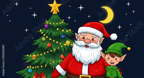 Pixel Art Santa and Elf by Decorated Christmas Tree at Night