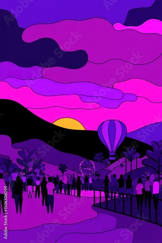 Pixel Art Sunset Landscape Purple Pink Hot Air Balloon Over Silhouetted Crowd