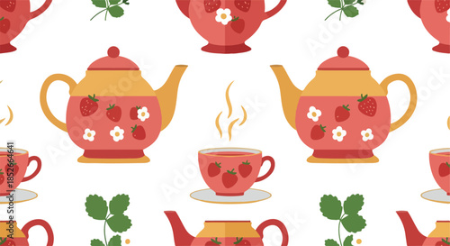 Pixel Art Tea Party Seamless Pattern Strawberry Teapots and Cups Flat Design
