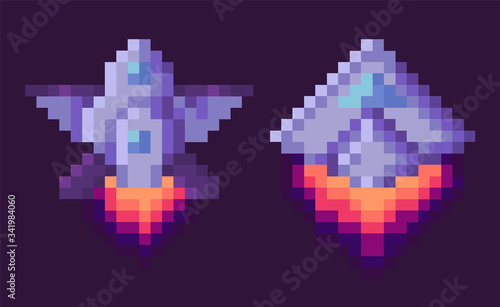 Pixel game vector, isolated set of spaceship run of fuel, outer space exploration, video gaming retro flat style. 8 Bit space ships with wings and flames, pixelated cosmic object for mobile app games