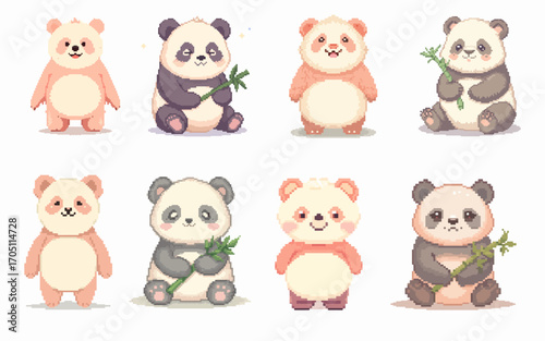 Pixel Panda Character Set with 8 Cute Poses and Expressions