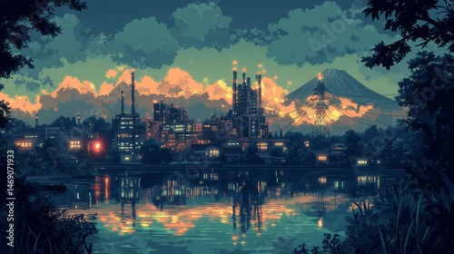 Pixelated cityscape reflected in tranquil waters at dusk.