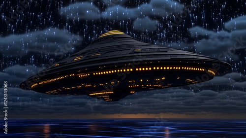 Pixelated Flying Saucer Over Dark Sea at Twilight