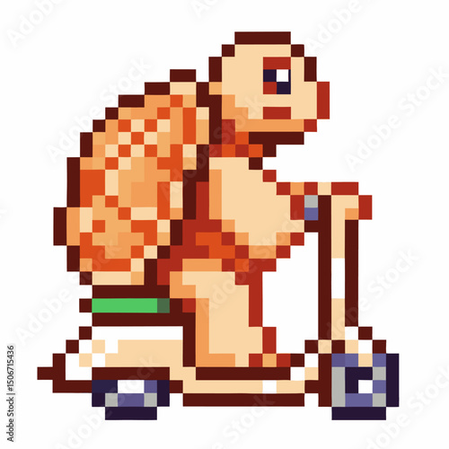 Pixelated tortoise on scooter, whimsical retro video game character in motion