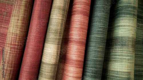 Plaid fabric in earthy tones of red and green, featuring a rustic woven texture that evokes a holiday and outdoors vibe.