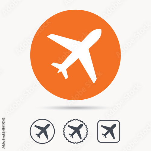 Plane icon. Flight transport symbol. Orange circle button with web icon. Star and square design. Vector