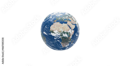Planet Earth, detailed continents, vibrant oceans, clouds, floating in transparent void with soft studio light, concept of global connection & future opportunities