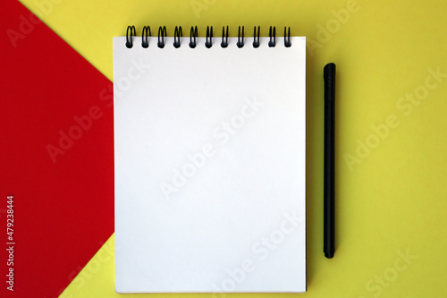 Planner layout, open blank spiral notebook for design, lettering, text, template. Yellow with red background, pen.