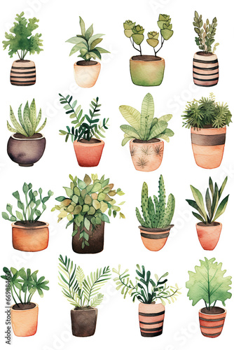 Plant flower pot set collection watercolor clipart isolated on white background