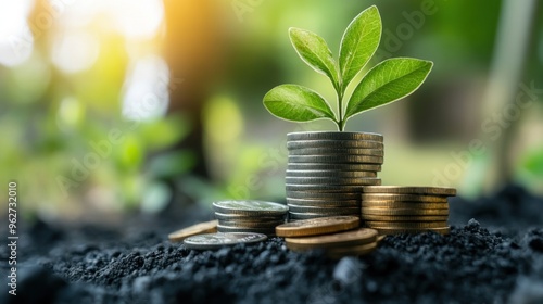 Plant growing on a pile of coins, symbolizing growth and investment