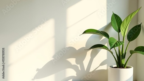 plant in a tub stands on the floor, casting a shadow on a smooth wall. Copy space