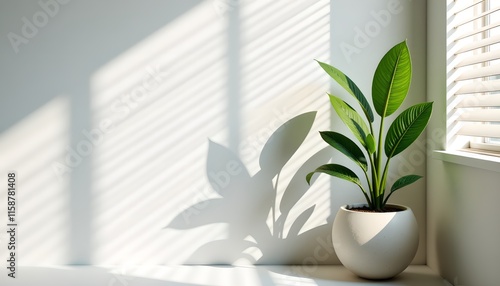 Plant in a tub stands on the floor near a sunny window, casting a shadow on a smooth wall. Copy space mockup