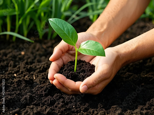 planting day world logo symbol. Two hands nurturing a small sapling in soil, symbolizing growth, care, and environmental conservation. Suitable for sustainability, nature, and growth concepts.
