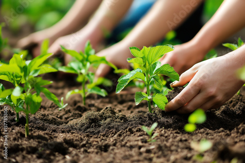 Planting young seedlings in a garden on a sunny day with hands in the soil