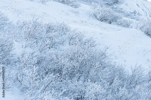Plants in the tundra in the Arctic are covered with hoar frost. Snow and rime ice on the branches of bushes. Beautiful winter background with twigs covered with hoarfrost. Cold snowy weather. Frosting
