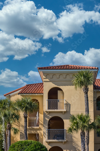 Plaster tropical resort hotel with a red tile roof