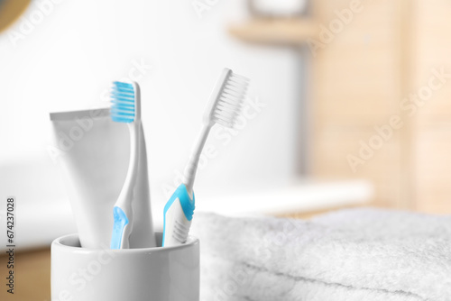 Plastic toothbrushes, toothpaste and towels on blurred background, closeup. Space for text