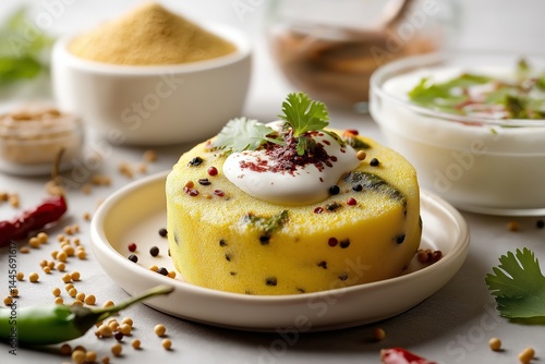 Plate of Dhokla, steamed fermented gram cake topped with sour cream, garnished with cilantro. Concept of vibrant Dhokla presentation in soft natural light, aesthetic arrangement.