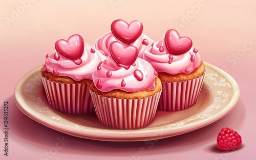 Plate of freshly baked love-themed muffins with raspberry glaze on a cozy warm background