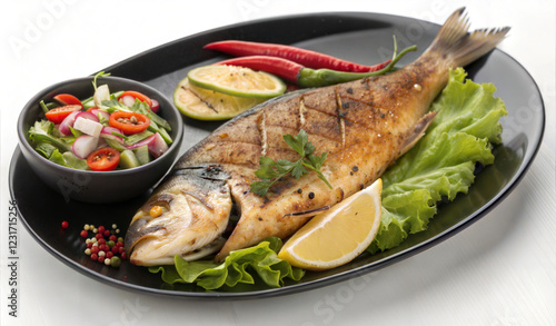 Plate with delicious sea bass fish fried