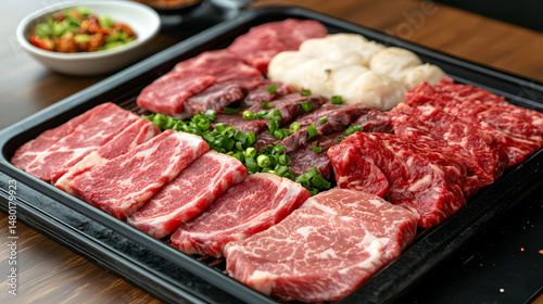 Platter of marinated beef and pork ready for grilling, featuring various cuts of meat with garnishes, creating delicious and inviting display