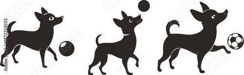 Playful Chihuahuas with Balls Fun Dog Silhouettes, Cute Dogs Sports Illustration, Dog Playing Football Vector Illustration