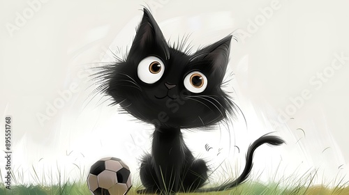 Playful Feline with Soccer Ball: A whimsical black cat with wide, curious eyes sits playfully beside a soccer ball, its tail curled in anticipation.