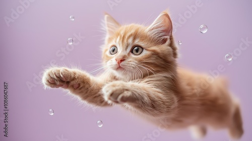 Playful Ginger Kitten Leaping Through Air Surrounded by Bubbles on a Soft Purple Background, Capturing a Moment of Joy and Curiosity in Nature