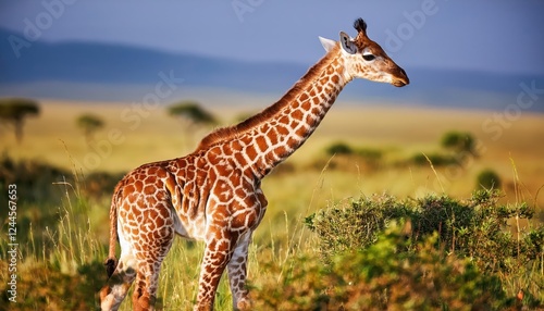 Playful Giraffe Calf Frolics in the Savannah Grasslands of Masai Mara, Kenya, East Africa, Showcasing Grace and Agility under the African Sun.