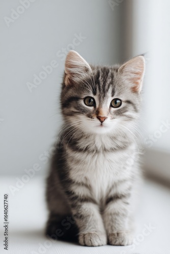 Playful kitten with striking fur pattern poses near window, capt