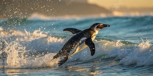 Playful Penguin Leaping from Ocean Waves: Underwater Wildlife Action Shot