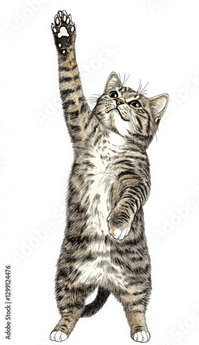 Playful Tabby Kitten Reaching Upwards on White Backgrounds for Studio Shot Portrait Closeup View. Small Kitten in Playful Pose with Active Energy. Adorable Kitten with Sharp Claws, Fluffy Fur and