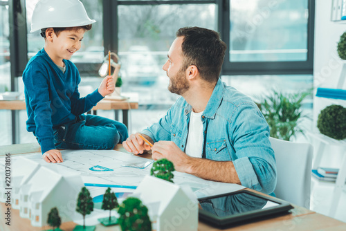 Pleasant communication. Pleased engineer listening to his son while working at sketch