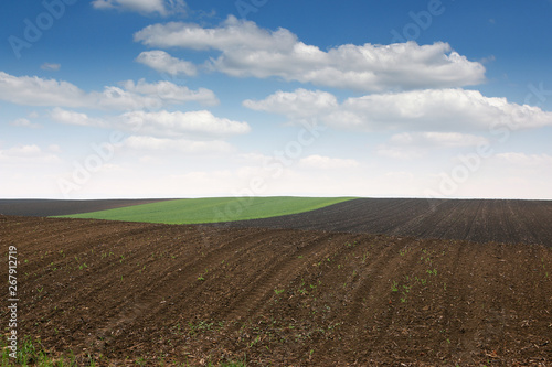 Plowed and green wheat field in spring landscape
