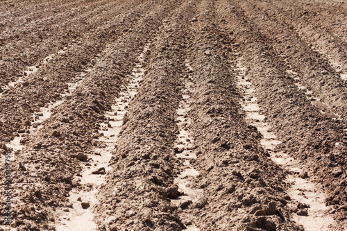 plowed field for planting, bare ground with grooves