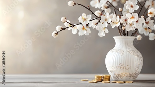 Plum blossoms cascading from an ornate porcelain vase, paired with scattered gold coins for a prosperous New Year image