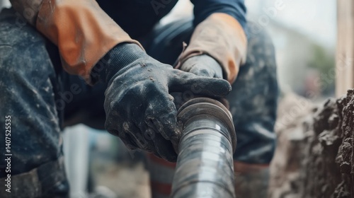 Plumber installing a drainage pipe at a construction site. Featuring expertise and skill