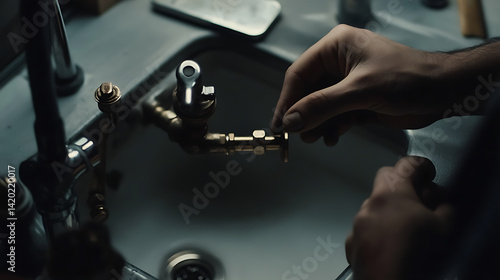 Plumber tightening a valve under a sink. Featuring expertise and attention to detail