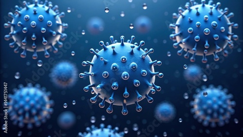PM2.5 particles. Microscopic view of blue viruses surrounded by droplets on a dark background.