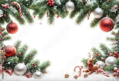 PNG festive christmas horizontal frame with branches decorated with colorful balls and snow