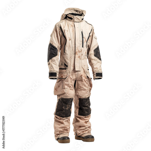 Png of front view of a beige and black hooded camouflage flight suit isolated on transparent background, featuring a modern design