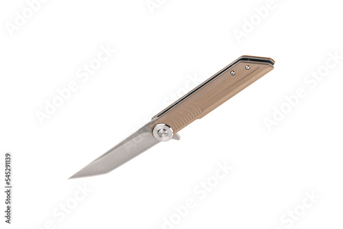 Pocket folding knife isolate on white back. Compact metal sharp knife with a folding blade.