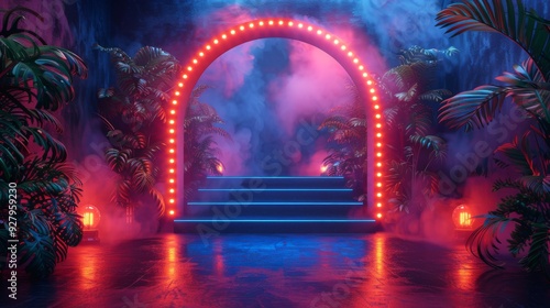 Podium for awards or product display illustration. Abstract empty 3d stage with neon glowing round frame on dark background. Luxury beauty industry design.