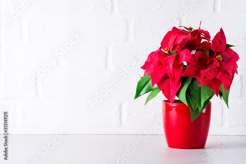 poinsettia on the kitchen countertop on the background of white brick tiles