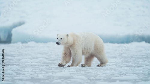 Polar bear walking Arctic ice floe, glacier background, climate change