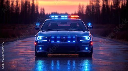 Police Car on Road with Sunset Background