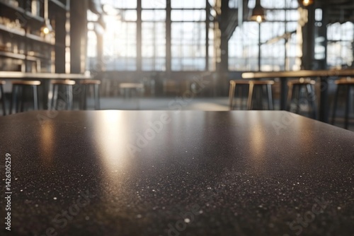 Polished stone countertop showcases subtle veining, set against industrial elements and bathed in soft daylight from expansive windows