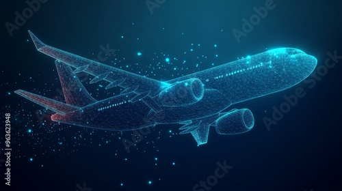 Polygonal airliner low poly. Vector mesh spheres from flying debris. Thin line concept. Blue structure style illustration