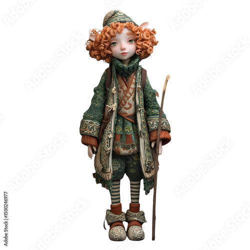 Polymer clay doll with a fantasy elf costume, isolated on transparent background