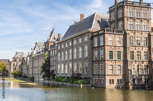 Pond Hofvijver (Court Pond) near historical Binnenhof (Inner Court) in City center of The Hague. Den Haag (The Hague). Netherlands.